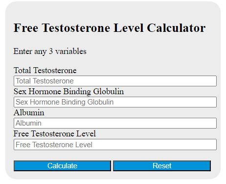 Numerous online calculators are available that can estimate your free testosterone levels based on your total testosterone and SHBG levels. These calculators provide a quick and convenient way to get an approximate idea of your free testosterone levels. However, it is important to note that these calculators are not as accurate as direct measurement.